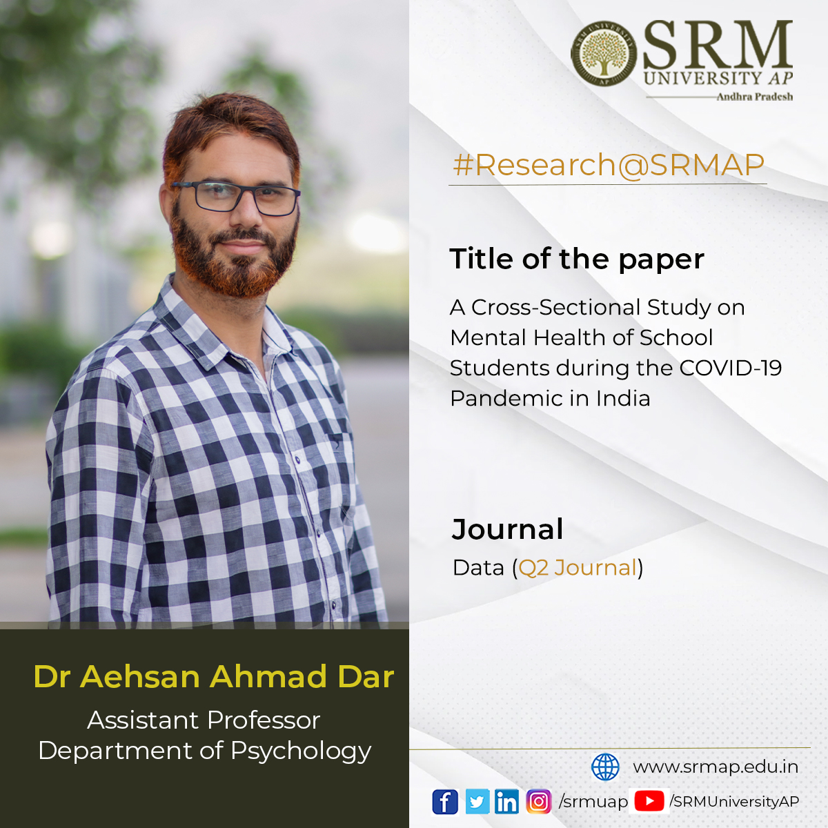 Dr Aehsan Ahmad Dar, Assistant Professor, Department of Psychology, published the article titled “A Cross-Sectional Study on Mental Health of School Students during the COVID-19 Pandemic in India” in the journal Data in collaboration with academicians from different universities across the country and abroad.